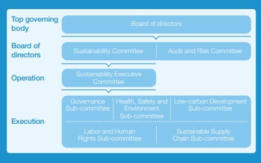 At the management level, the company set up a sustainable development executive committee and five professional sub-committees to oversee five respective areas (sustainable governance, health, safety and environment, low-carbon development, labor rights, and sustainable supply chain). These sub-committees are to implement sustainable development initiatives in their respective fields.